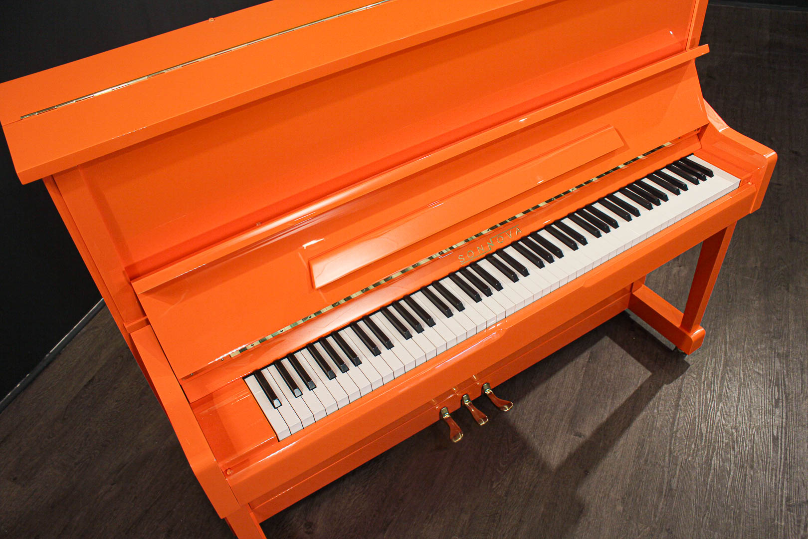 The Orange Sonnova Upright is ideal for maximalist-inspired interiors. Its high-gloss finish brings bold color and visual impact, while the 48" studio upright delivers full, resonant sound beneath the surface. Polished brass pedals, hardware, and accents complete the look.