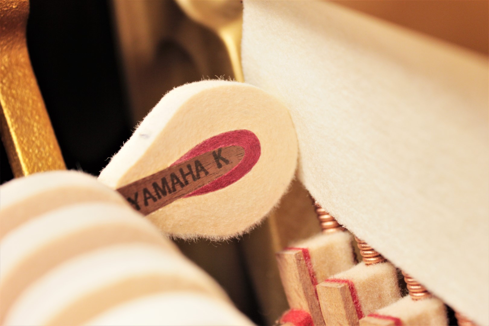 Warn or degraded hammer return spring cords are replaced on Yamaha upright pianos to ensure proper note repetition and dexterity of the action.