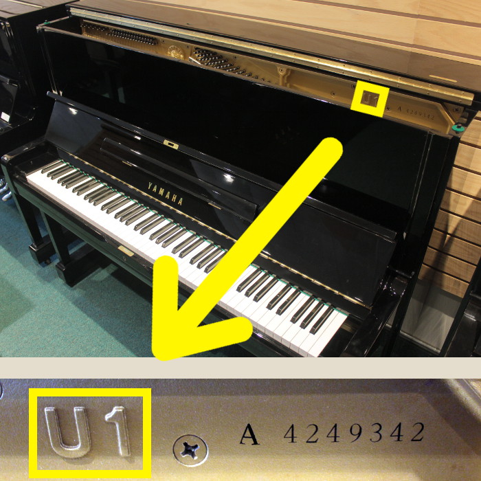 The model is usually found inside the piano with the lid open, near the front of a grand piano or top of an upright piano. It's often a short series of letters and/or numbers either painted or embossed on the cast-iron harp.