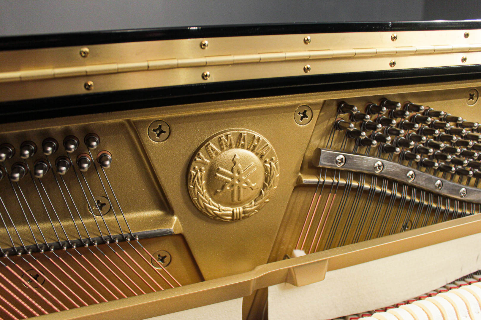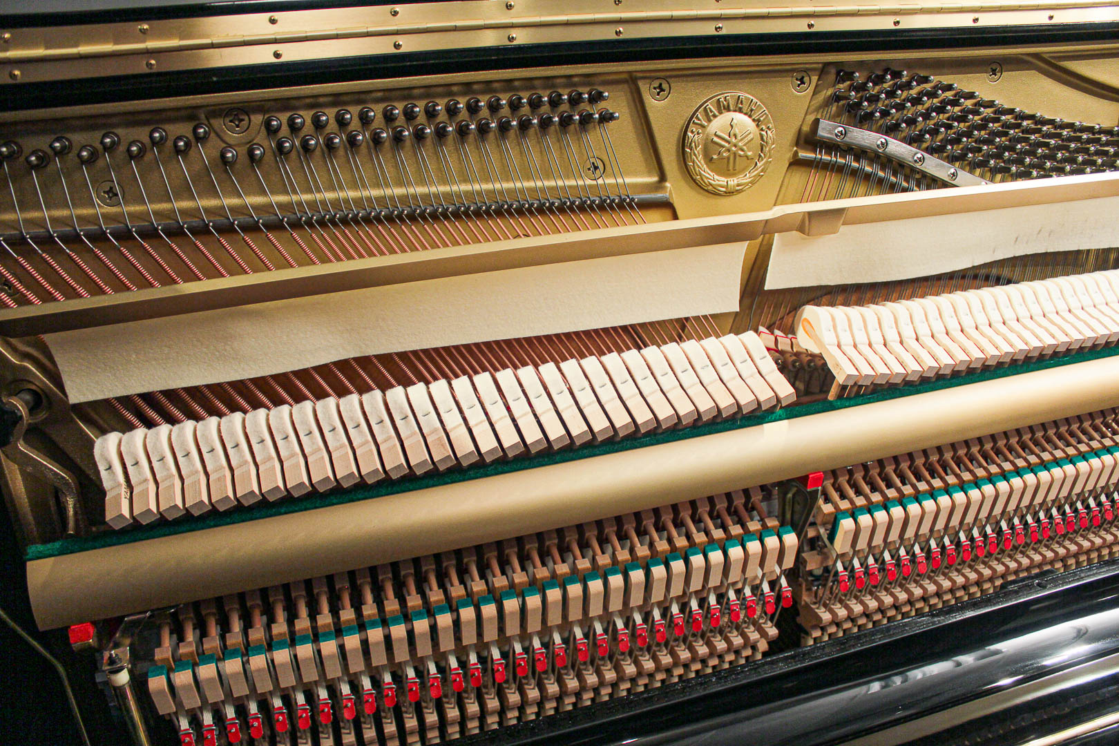 Warn or degraded hammer return spring cords are replaced on Yamaha upright pianos to ensure proper note repetition and dexterity of the action.